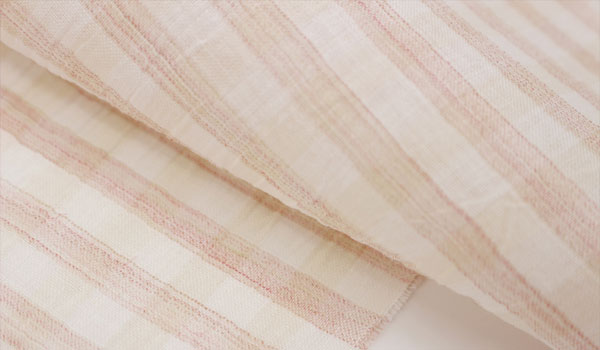 色は優しいピンクで、トップ染の糸で織り上げたボーダーチェック柄です。