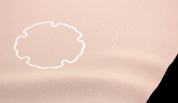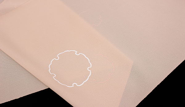 落ち着きのある上品な優しいサーモンピンク色に、白とピンクの雪輪がフワッとシルエットに浮かび上がる染です。