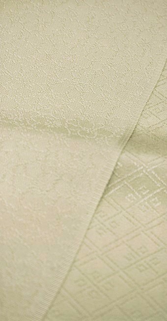 地模様に光沢があるこの帯揚げは、反面が桜の花が一面に詰まった織になっています、その裏側は「業平格子」の菱文様が織り上げられた両面織になっています。