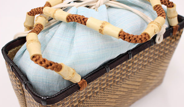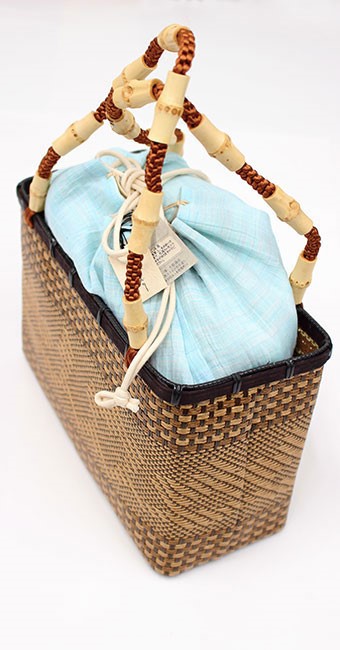レトロ感漂う竹籠に近江ちぢみの麻巾着が上手くマッチして夏のお出かけをオシャレにコーディネートできます。
