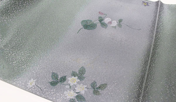 きらきらと銀糸が輝く帯地に様々な花柄を染めた、手描き友禅による高級染帯の逸品です。