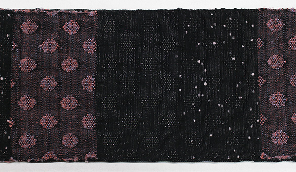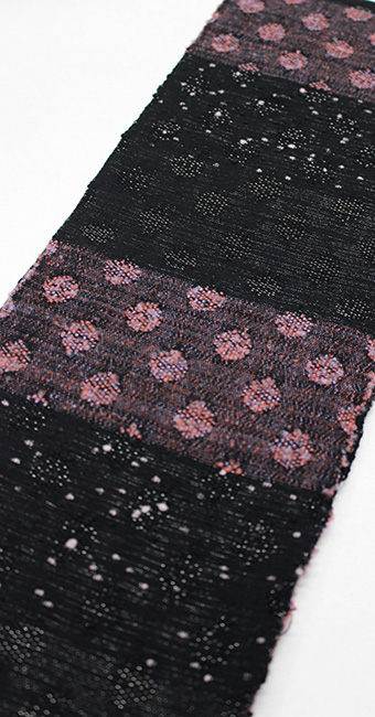 もう一方も同じ黒の水玉模様に薄ピンク・薄グレーのジュズモールを織り込み、続いて黒に珊瑚色・薄藤紫で水玉模様が織り上げられています。