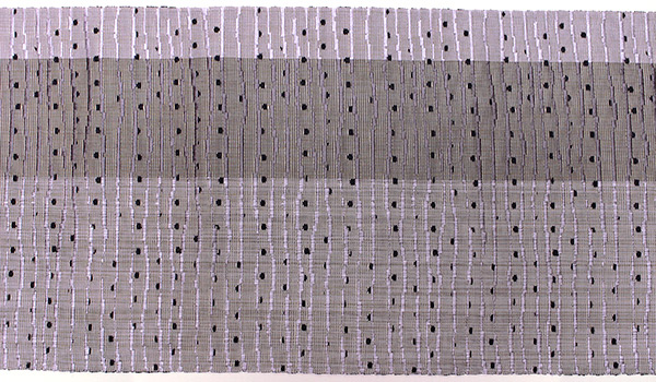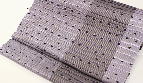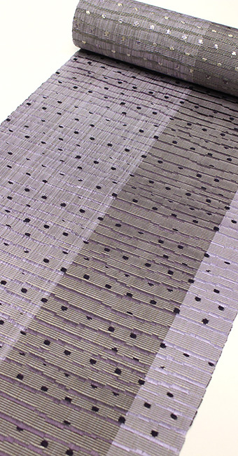 夜空を想わすようにグレーに藤紫が途中に入り、水面に星が映るように濃い紫のドットが見え隠れする情景を織で表現しています。