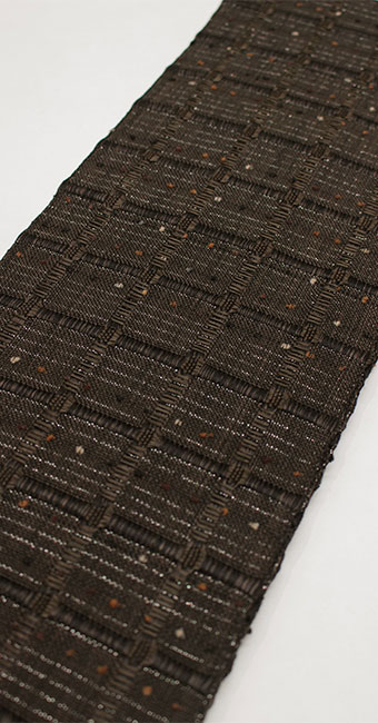紋織の光沢を活かして格子模様を凹凸で浮かび上がらせています。横に金属糸を入れて、シックな色の中に「キラキラ感」を出した煌めきのある都会的な仕上がりになっています。