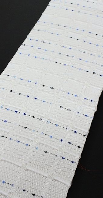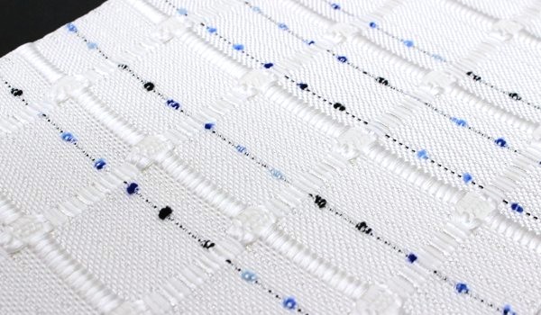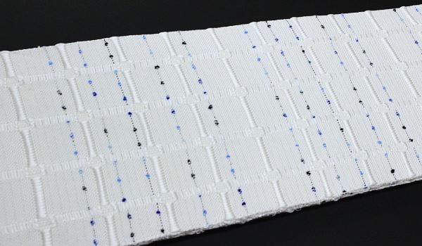 紋織の光沢を活かして格子模様を凹凸で浮かび上がらせています。横に金属糸を入れて、白に「キラキラ感」を出した煌めきのある都会的な仕上がりになっています。