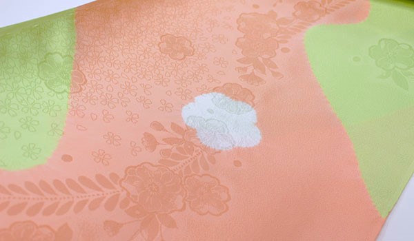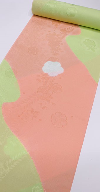 色は明るく綺麗な黄緑と、少しくすんだオレンジ系ピンクの染分で、所々に白抜きの梅柄絞りが可愛く入り素敵な作品です。