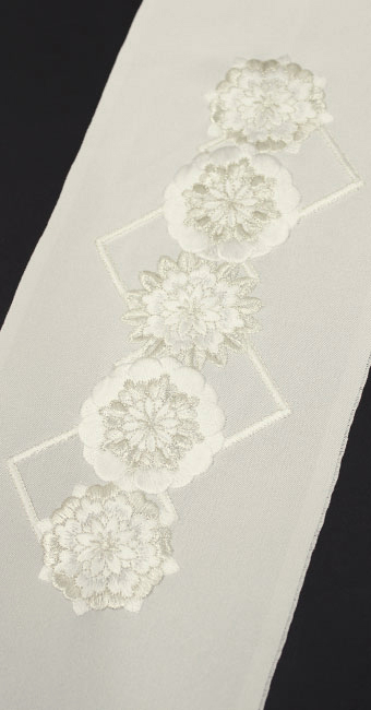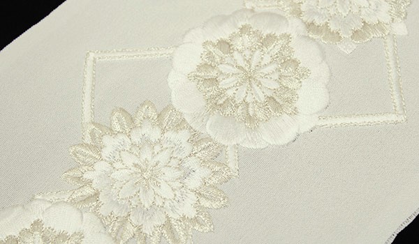 白地に白とアイボリーの刺繍で、豪華な花模様が5つタテに並び、背景には菱格子があしらわれています。