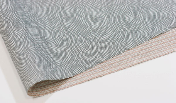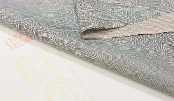 表地には裃文様の青海鮫をグレーで染め上げ、裏地には淡いピンク系の縞友禅を染め上げています。