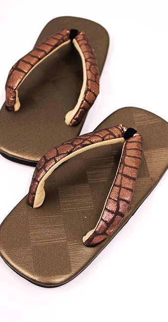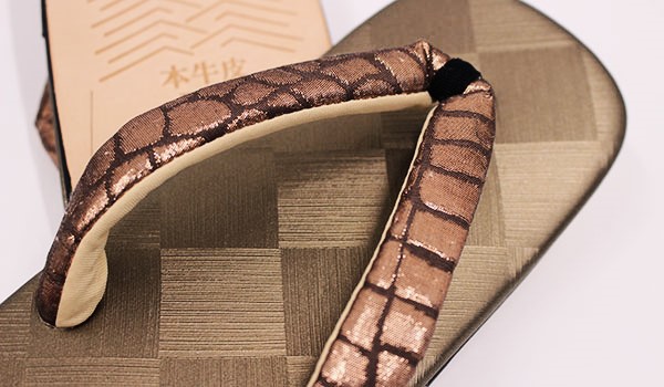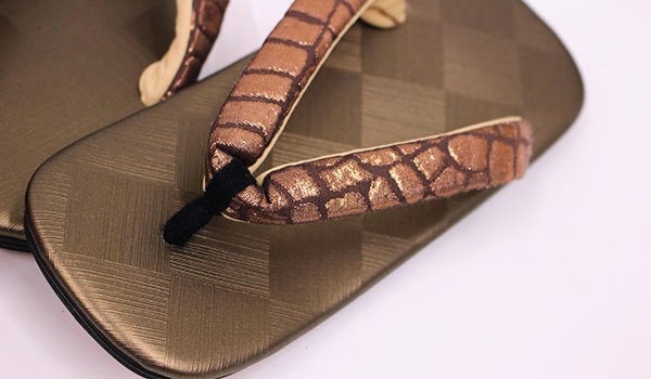底は牛革で、台は合皮で渋い金茶でシックな光沢感がある市松格子模様、鼻緒は西陣織の帯地を使った茶系の煌めきがあるタイプです。