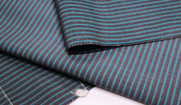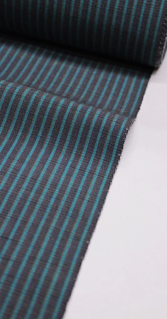 シックな墨黒に鮮やかなターコイズブルーの縞模様を織った縞のカジュアルでおしゃれな紬です。