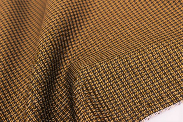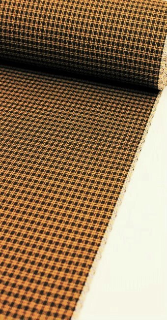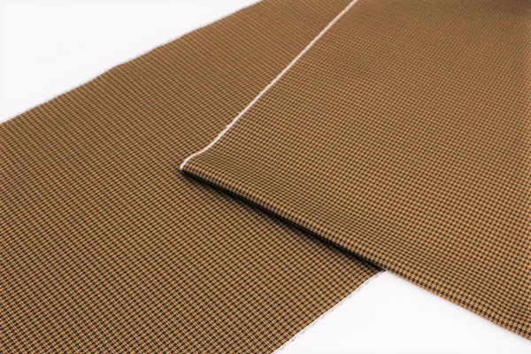 格子模様でシンプルにカジュアル感を出して、焦げ茶に金茶の配色で格子柄を織った粋な着尺が出来上がりました。