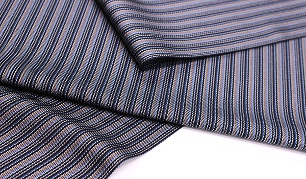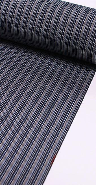 グラデーションに色を変えて数色の色が並んだ細い縞を織った、カジュアルな縞織物で、男物ならではの粋な色彩にしてあります。