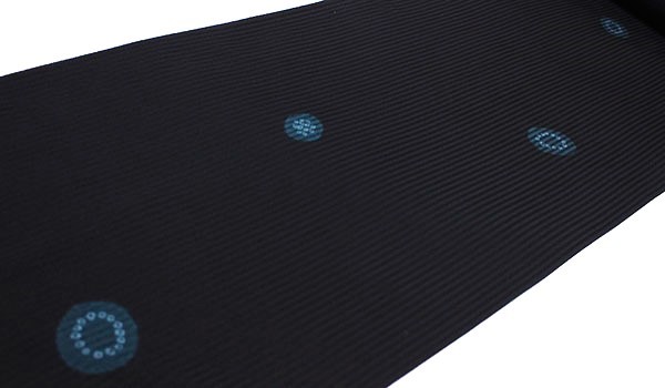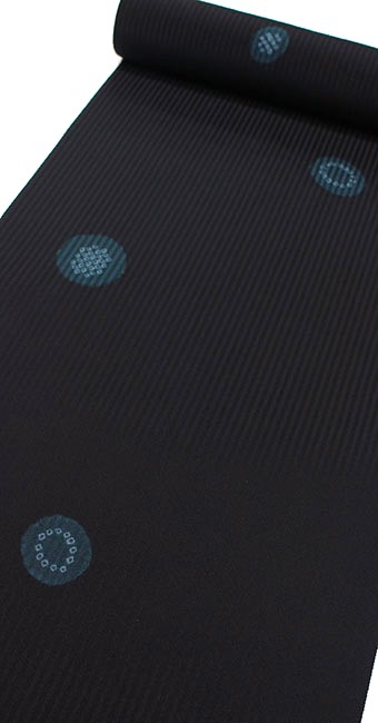 全体はシックな墨黒で、絞りは藍色系のお洒落な色の絞りです。「輪出し」と呼ばれるように、帽子絞りしてから桶を使い染色する桶絞り染をしています。大小大きさを変えた丸絞りに、鹿の子疋田絞りもアクセントになり、絞りの特徴を飛び柄で表しています。