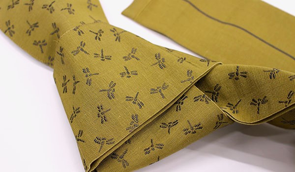 和服らしさを強調できる「とんぼ」の古典文様を、おしゃれな金茶に織り上げています。