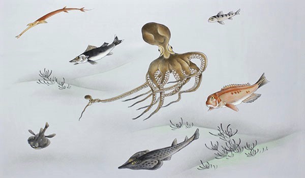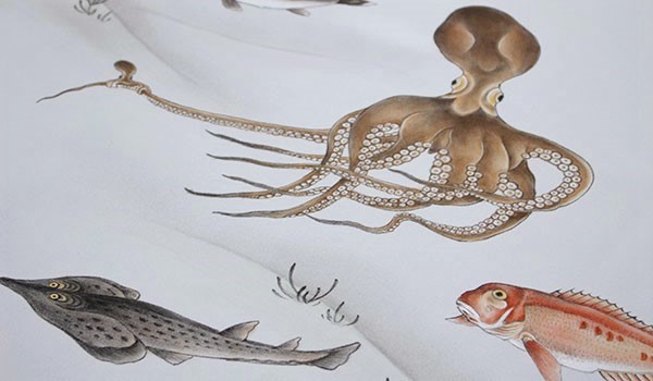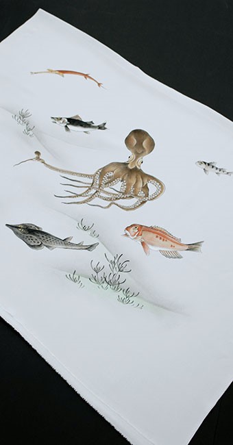 伊藤若冲の作品「群魚図《蛸》」を、京都におられる手描き友禅の染職人さんに染めて頂いた、高級逸品モノ男物額裏(羽裏)地です。