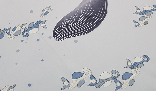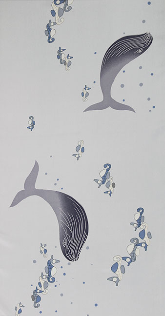 ブルーの地色に力強い鯨と、かわいいタツノオトシゴを描き海の物語を表現しております。