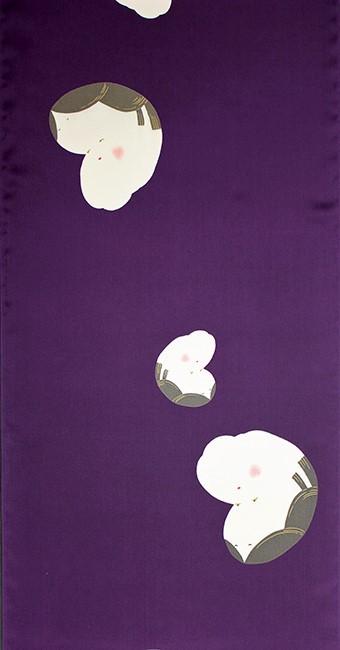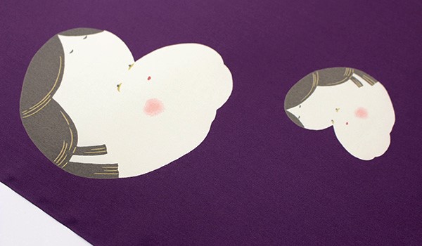 紫の地色に可愛らしい表情のおかめが描かれています。