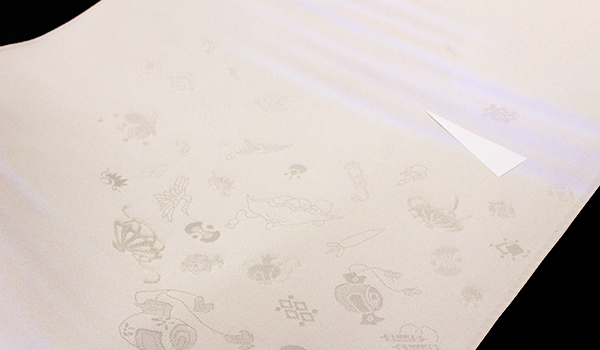 染色方法は機械捺染によるもので、クリームの濃淡と淡い藤色が入ったカスミぼかしです。