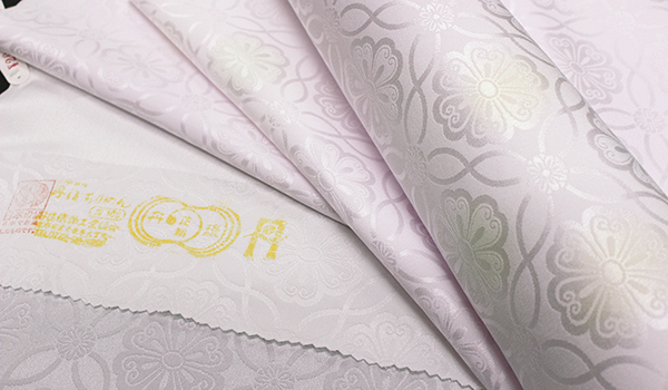 最近では珍しくなった、ちりめん組織の紋綸子です。緯糸に八丁撚糸(水撚り)という強撚糸を使って織ってあるので、楊柳のような凹凸のシボがあり、ヨコに伸縮するストレッチが効いている高級綸子地です。