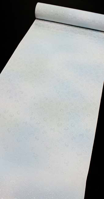 光沢ある地紋の生地質を活かすように、上品な配色で染めてあります。淡いブルーに淡いグリーンのミックスぼかしになった、綺麗なボカシ友禅になっています。