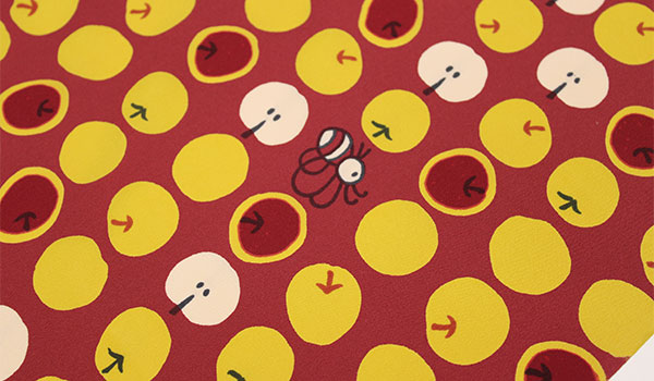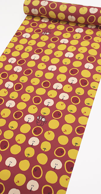 赤の地色に赤、黄でリンゴや蜂を描いたレトロでカワイイデザインです。