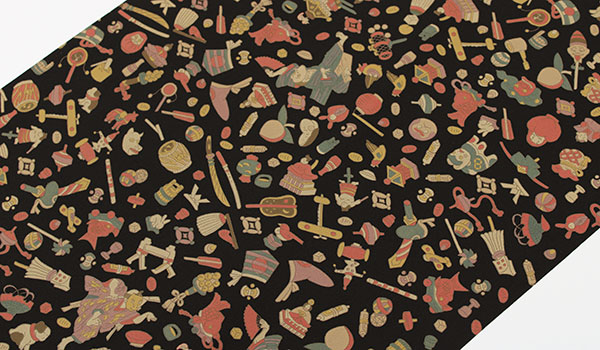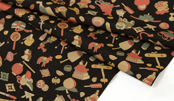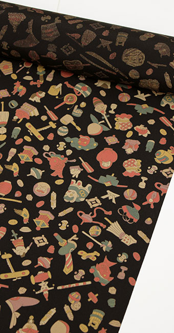 ダルマ・獅子舞・小槌・おかめ・ひょっとこ・独楽・内裏など、一つ一つのデザインが可愛らしく描かれ、モダンでおしゃれなデザインに染め上がりました。