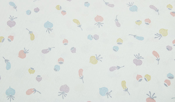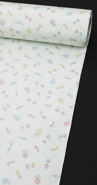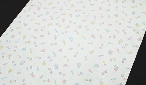 福井県春江にある、織屋:坪金工業で織られた、高級精華を使ったおしゃれ長襦袢です。 精華のサラリとした風合いは、長襦袢にとても適したきじです。 野菜模様の柄を機械捺染で小紋柄にあげてあります。 薄いグリーンの地色に、茄子・カブ・栗といった野菜が反物全体に上品な色彩でカラフルに描かれています。 大島、紬、小紋などカジュアルな着物の下にオススメの粋な長襦袢です。