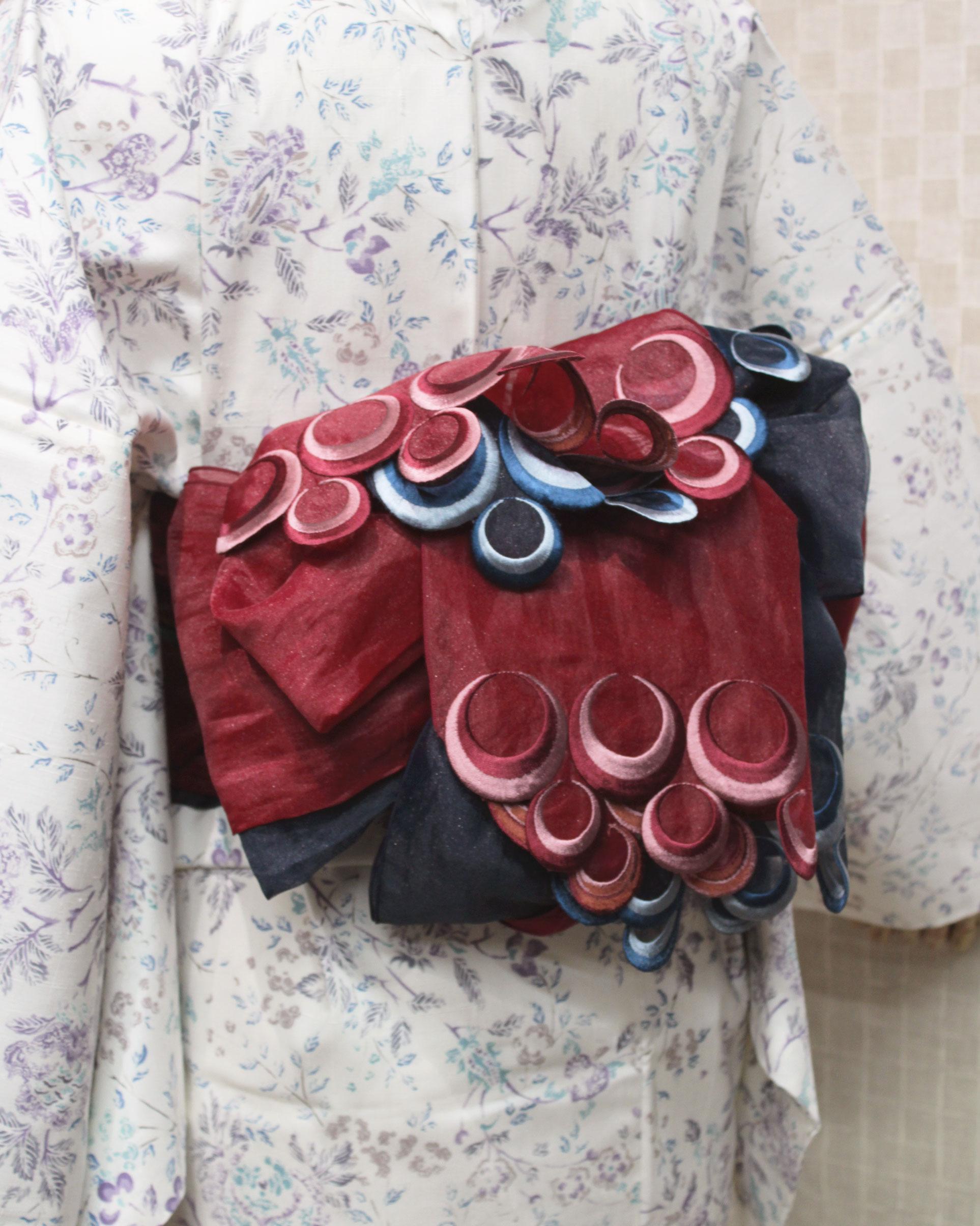 お召機で強撚糸を使って織っているので、軽いのに丈夫で締めやすく、締めた後も緩んでこないなど、いいことが沢山ある素敵な帯です。