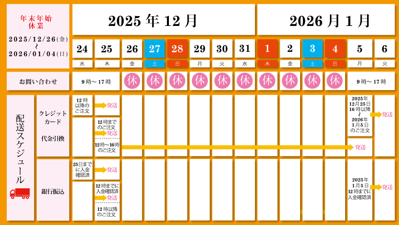 2025年12月25日(木)12時までのご注文商品に関しては、決済および入金確認をしてから2025年12月26日(金)までに発送いたしますが、2025年12月25日(木)12時以降のご注文に関しては、年明けの2026年1月5日(月)以降の発送となります。