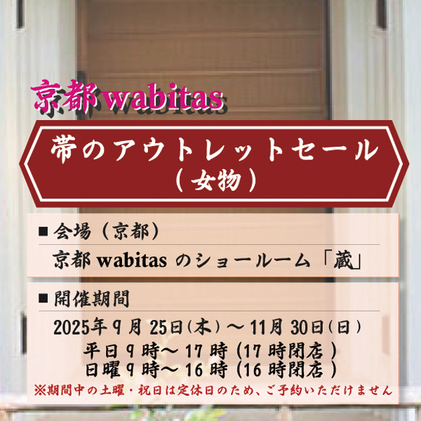 2025年9月24日 13時22分着物通販サイト京都wabitasの決算セールの一環として、女物の帯を対象に「在庫処分」など帯のセールを11/30(日)まで京都のショールームで開催しております。