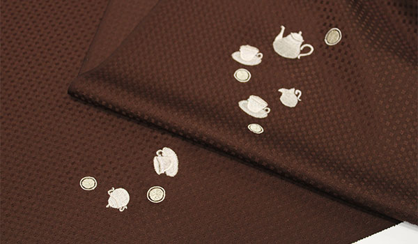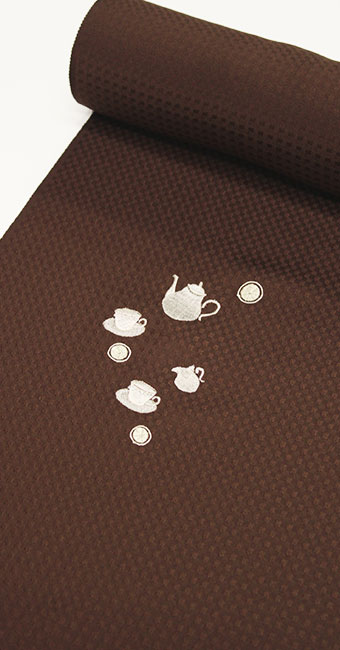 ■ 刺繍の小紋//正絹反物 ティーセットの刺繍:ブラウン【生地は丹後紋意匠】
