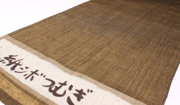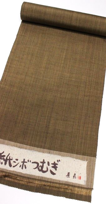 小千谷のシボは絞る加工、近江のシボは手揉み加工で、麻織物などにシワのようにシボを付けますが、この紬の凹凸のシボは、凹凸の型が付いた柿渋の和紙があり、それに押さえつけてシボの型を生地に付ける「紙シボ」の技法を用いてます。